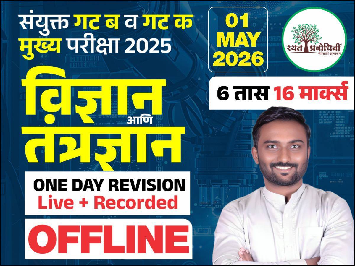 हे लेक्चर १ मे २०२६ रोजी होईल. या कोर्सच्या पावतीच्या आधारे विद्यार्थ्यांना ऑफलाईन लेक्चर साठी प्रवेश दिला जाईल. ६-७ तासात १६ मार्कांसाठी असणारा विज्ञान आणि तंत्रज्ञान (ICT & Remote sensing) हा घटक पूर्ण रिव्हीजन स्वरूपात करून घेतला जाईल. प्रिंटेड स्वरूपात शॉर्ट नोट्स ऑफलाईन च्या विद्यार्थ्यांना मिळतील.
